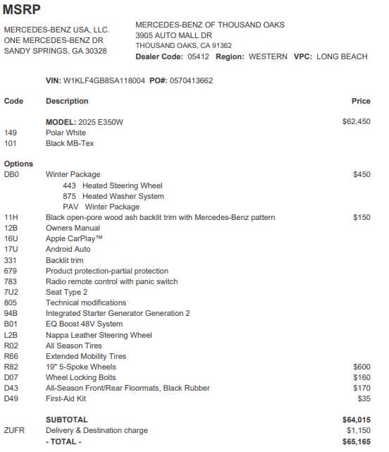 Step into the vibrant lifestyle of Southern California with the 2025 Mercedes-Benz E 350, where every drive along the coast or through the city is an unforgettable experience. As you settle into the heated driver seat, the cabin envelops you in comfort, while the heated steering wheel adds a touch of warmth on chilly mornings. The expansive view through the back-up camera provides confidence in every maneuver, transforming tight parking situations into effortless experiences amidst the vibrant SoCal landscape. With the Winter Package, youre equipped to embrace the elements, featuring a heated windscreen washer system that keeps your view clear, no matter the weather. The turbocharged engine roars to life, delivering exhilarating performance as you navigate winding roads or open highways. The 19 5-spoke light-alloy wheels not only enhance the vehicles striking appearance but also provide a smooth, confident ride. The power liftgate makes loading and unloading effortless, whether youre heading to the mountains for a weekend getaway or simply running errands around town. With advanced navigation guiding your way, every destination feels within reach. This E 350 is not just a car; its a statement of sophistication and a commitment to excellence. Ready to elevate your driving experience? Visit us today and let the 2025 Mercedes-Benz E 350 take you on a journey where luxury meets performance.