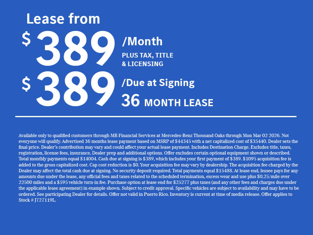 WHEELS: 18 TWIN 5-SPOKE (STD), Power Liftgate, Back-Up Camera, Turbocharged, Satellite Radio, iPod/MP3 Input Mercedes-Benz of Thousand Oaks is your local Mercedes-Benz dealership, serving the Thousand Oaks and Los Angeles Metro area since 1982. Our showroom always includes the most current luxurious and sophisticated Mercedes-Benz models. Were only a short trip from many communities, including Malibu and Simi Valley, and our team is happy to provide sales, financing, and automotive service and repair on site.